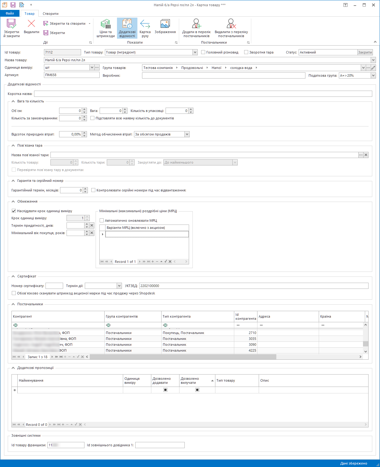 Для товарного найменування існує багато параметрів, необхідних для коректного автоматичного обрахунку. Це і різні параметри автоматичних начислень та автоматичних обмежень.